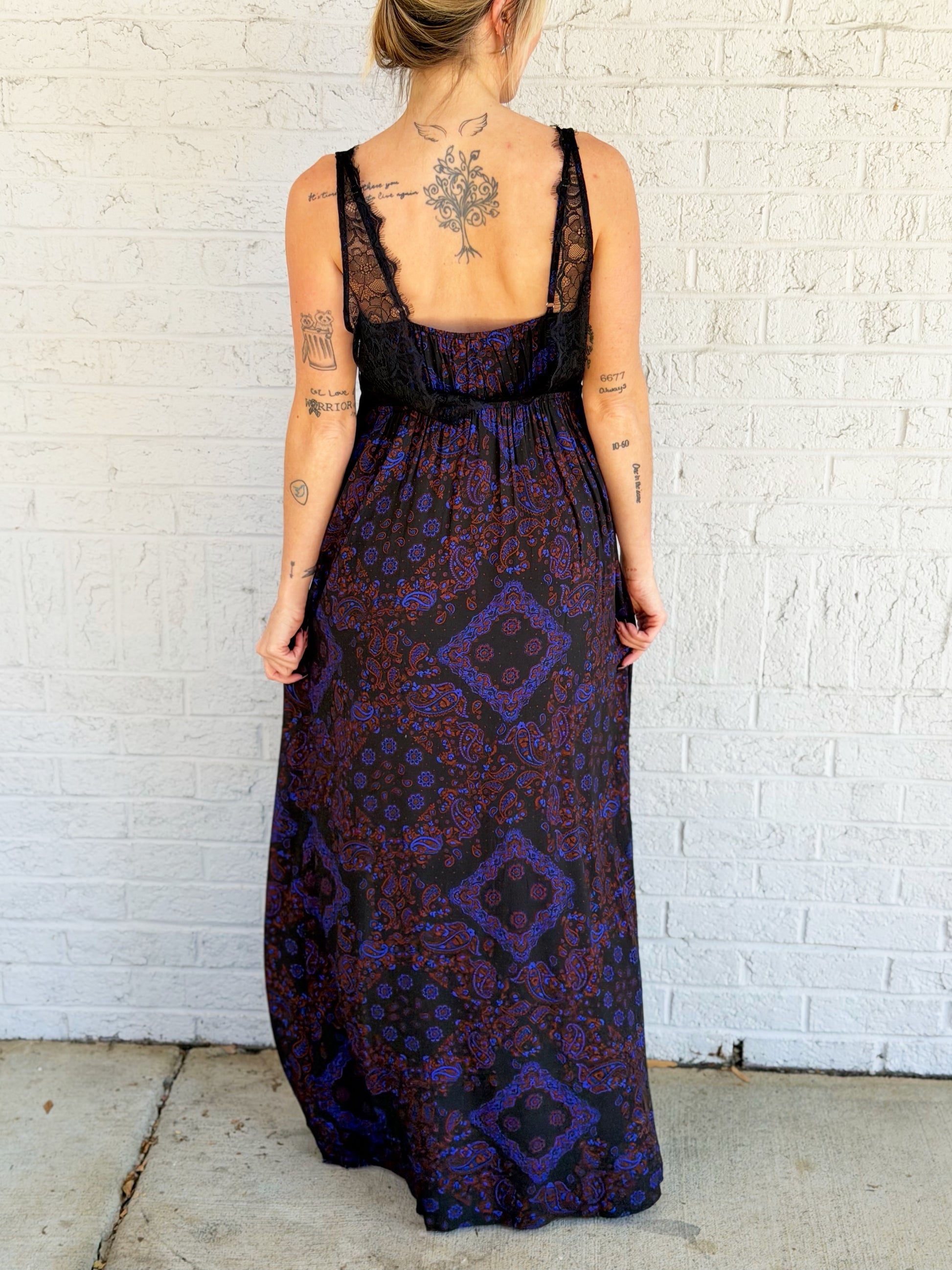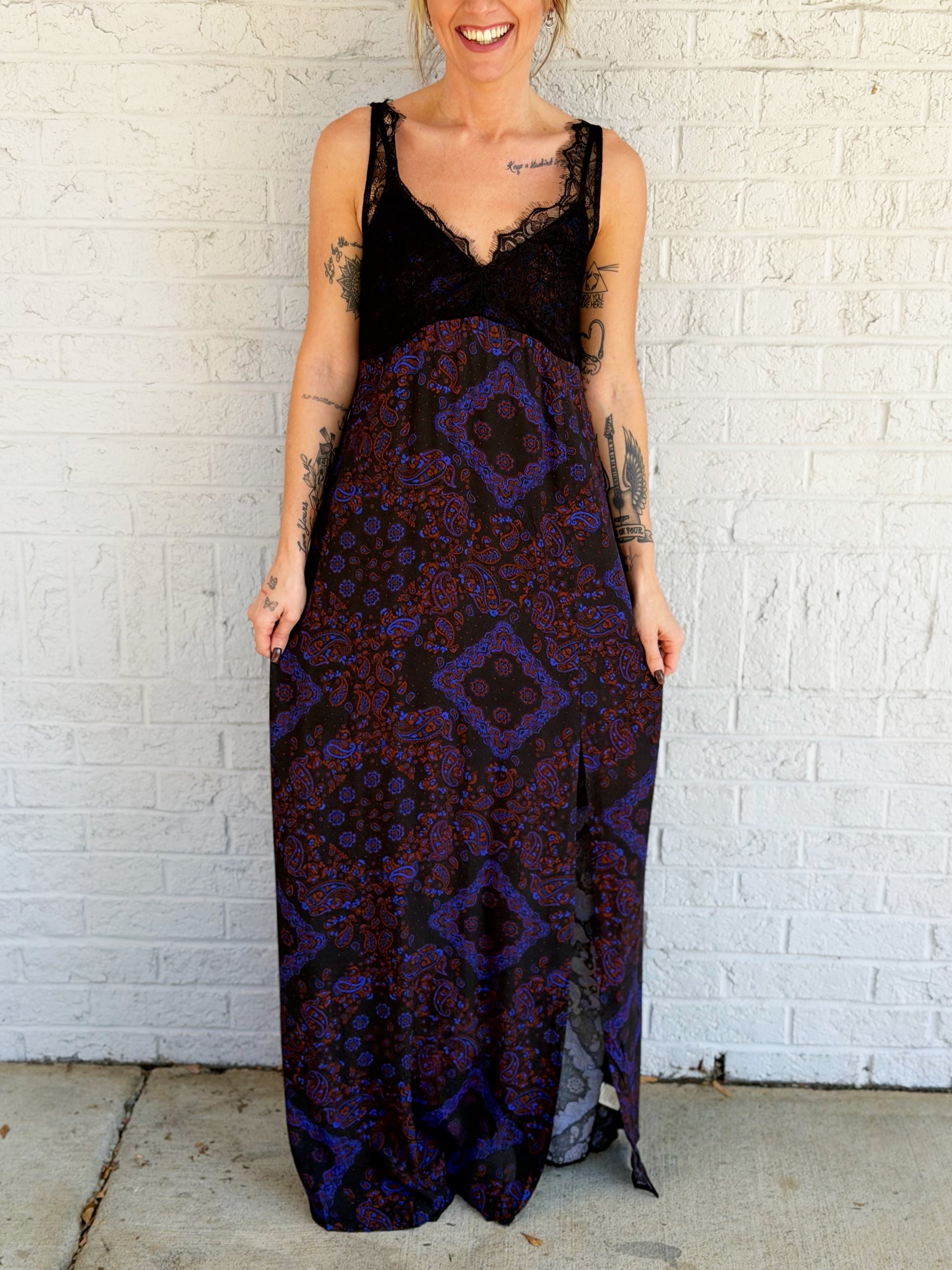 This elegant semiformal maxi dress combines classic paisley bandana print with sophisticated details. The sleeveless design is complemented by a delicate contrast lace top, adding refined texture and visual interest. A back elastic waistband ensures a comfortable, flattering fit, while the side slit introduces subtle movement and ease. Perfectly suited for occasions where graceful style meets comfort.