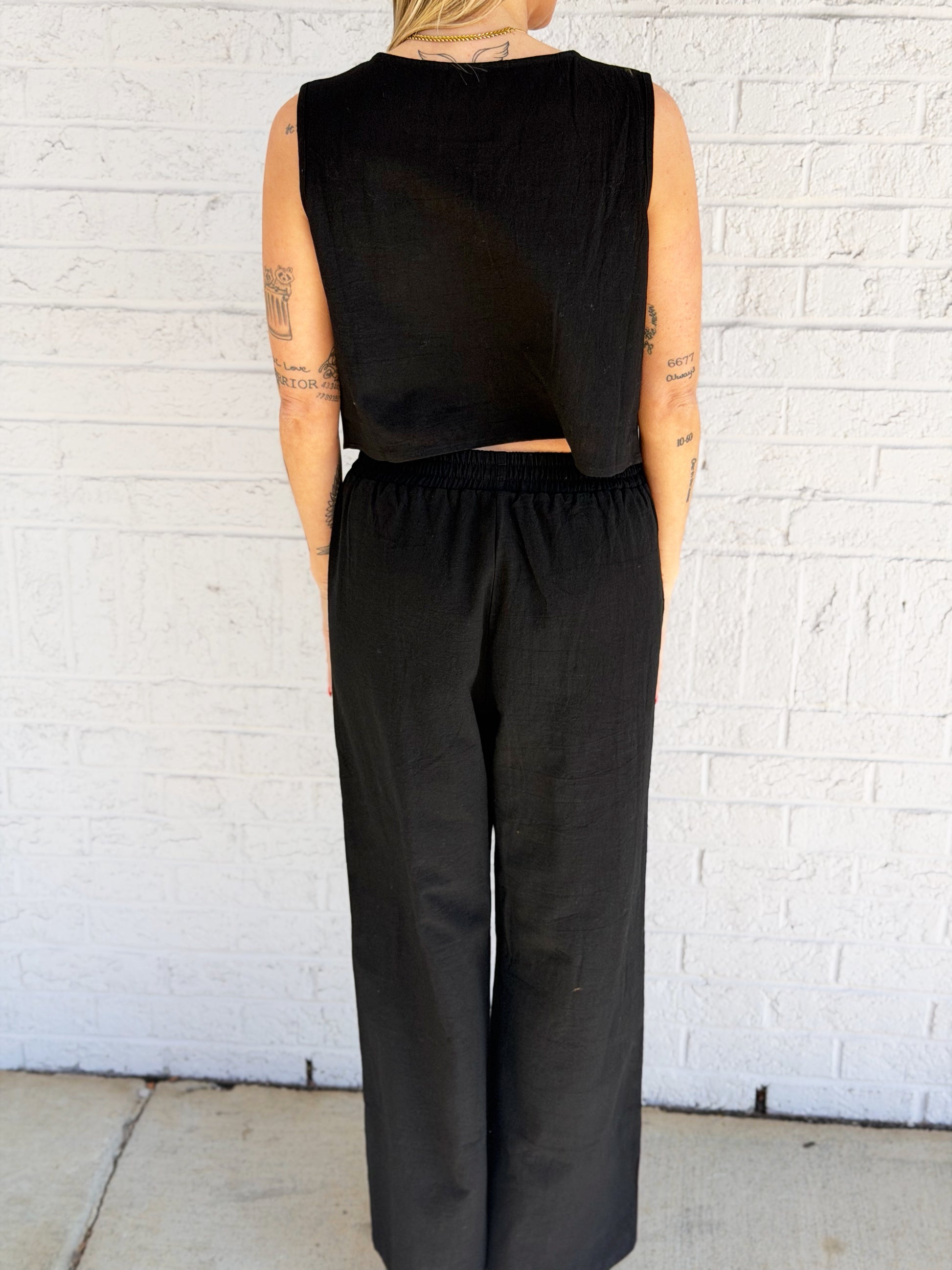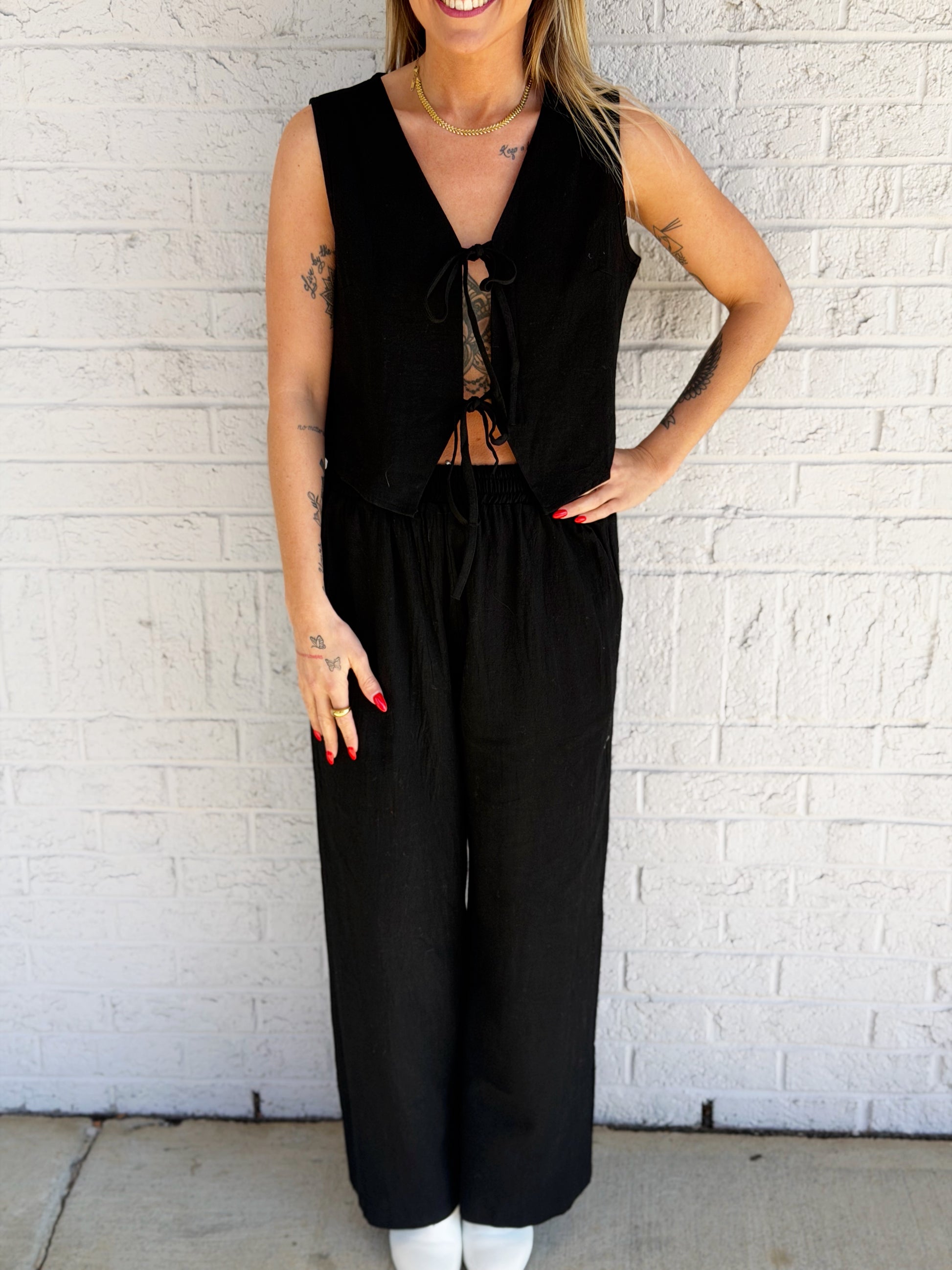 The Linen Two-Piece Pants Set is crafted from high-quality linen, offering breathability and comfort. The versatile tie top allows for adjustable styling, making it ideal for vacations or casual outings. Its lightweight fabric ensures ease of movement, promoting a relaxed fit suitable for warm weather conditions.